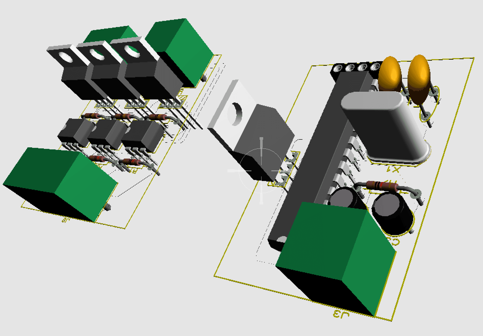 After some hours in front of Proteus, I designed my circuit and PCB. I have split the circuit into two parts, the "Arduino" side with the microcontroller atmega328 and the rest of the circuit with the triacs and the optocouplers.
