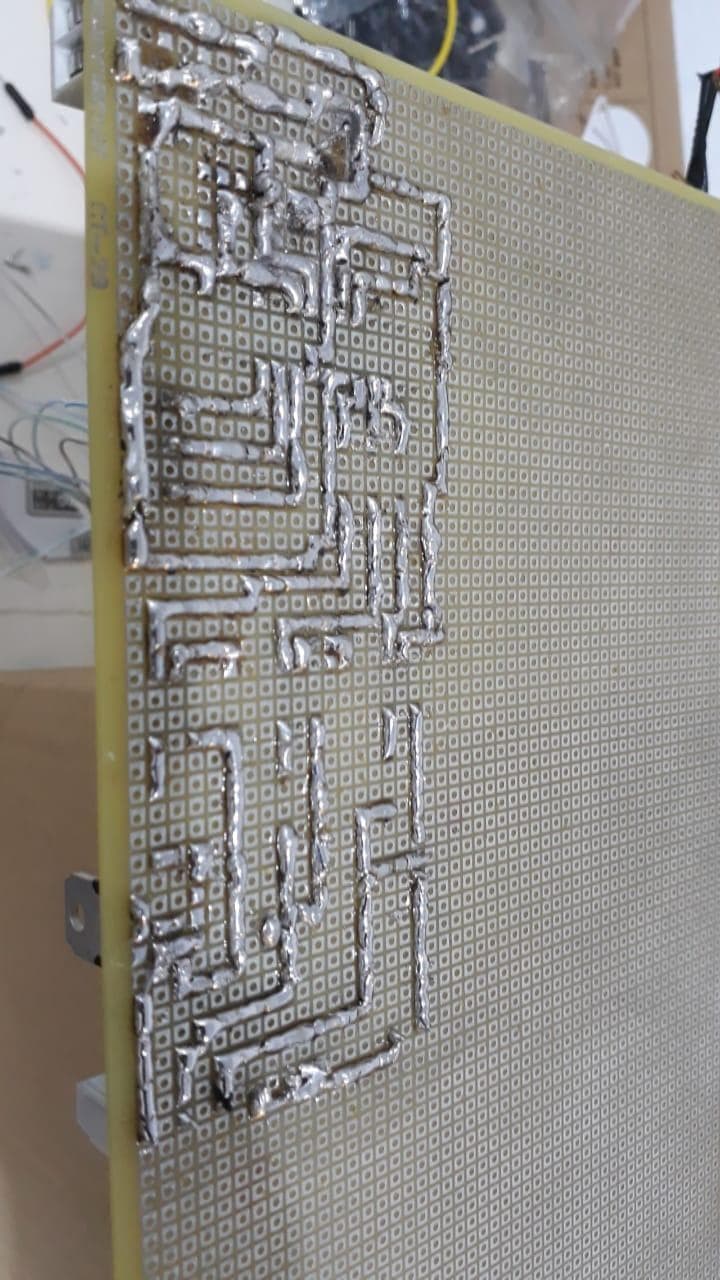 I started to design in the paper how to organize the tracks in the typical PCB for soldering. There isn't too much to say, at the beginning, it is hard to solder because the tracks are very near and you don't want to create a very big circuit. After spending some time soldering I got more experience and started to do a little bit better. I spent 10 hours soldering my circuit :(.