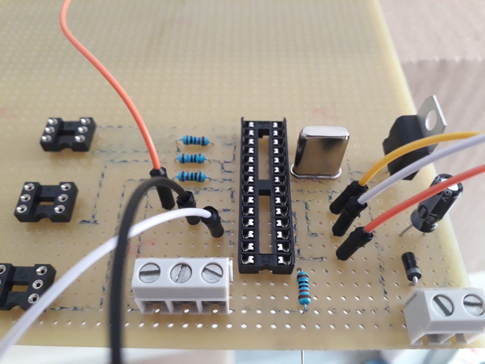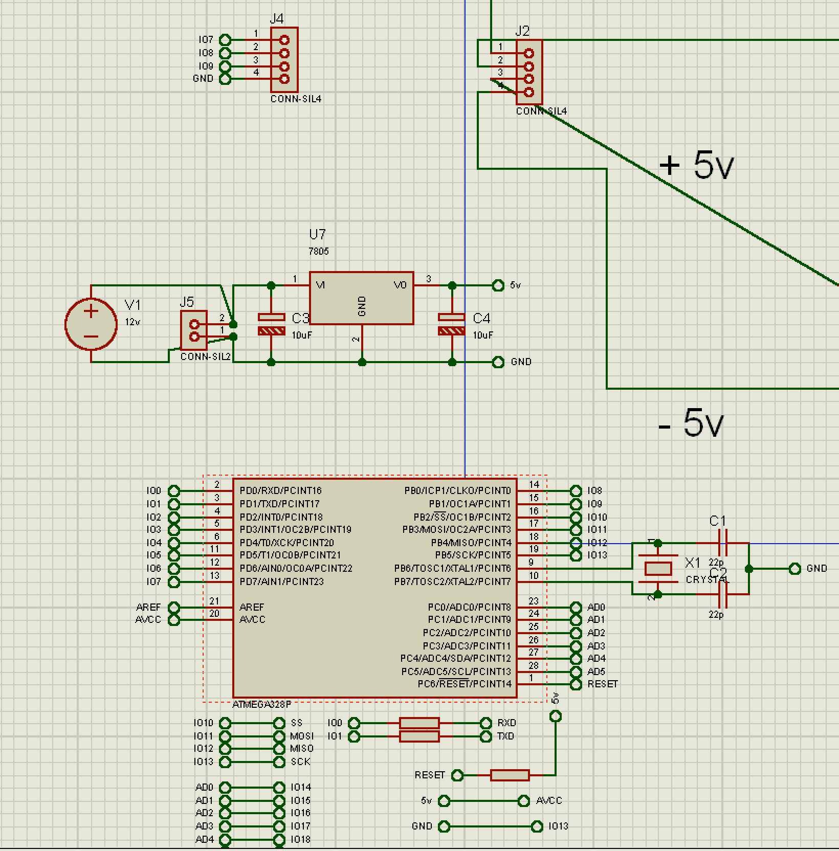 Here is the microcontroller atmega328 with an L7805 limiter.
