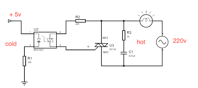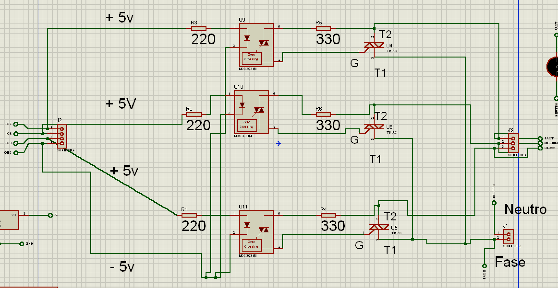 Then I can use it to control the fan speed using triacs in the hot side with the microcontroller pulse in the cold side, this is an example of switching on a bulb or fan with only one speed.
