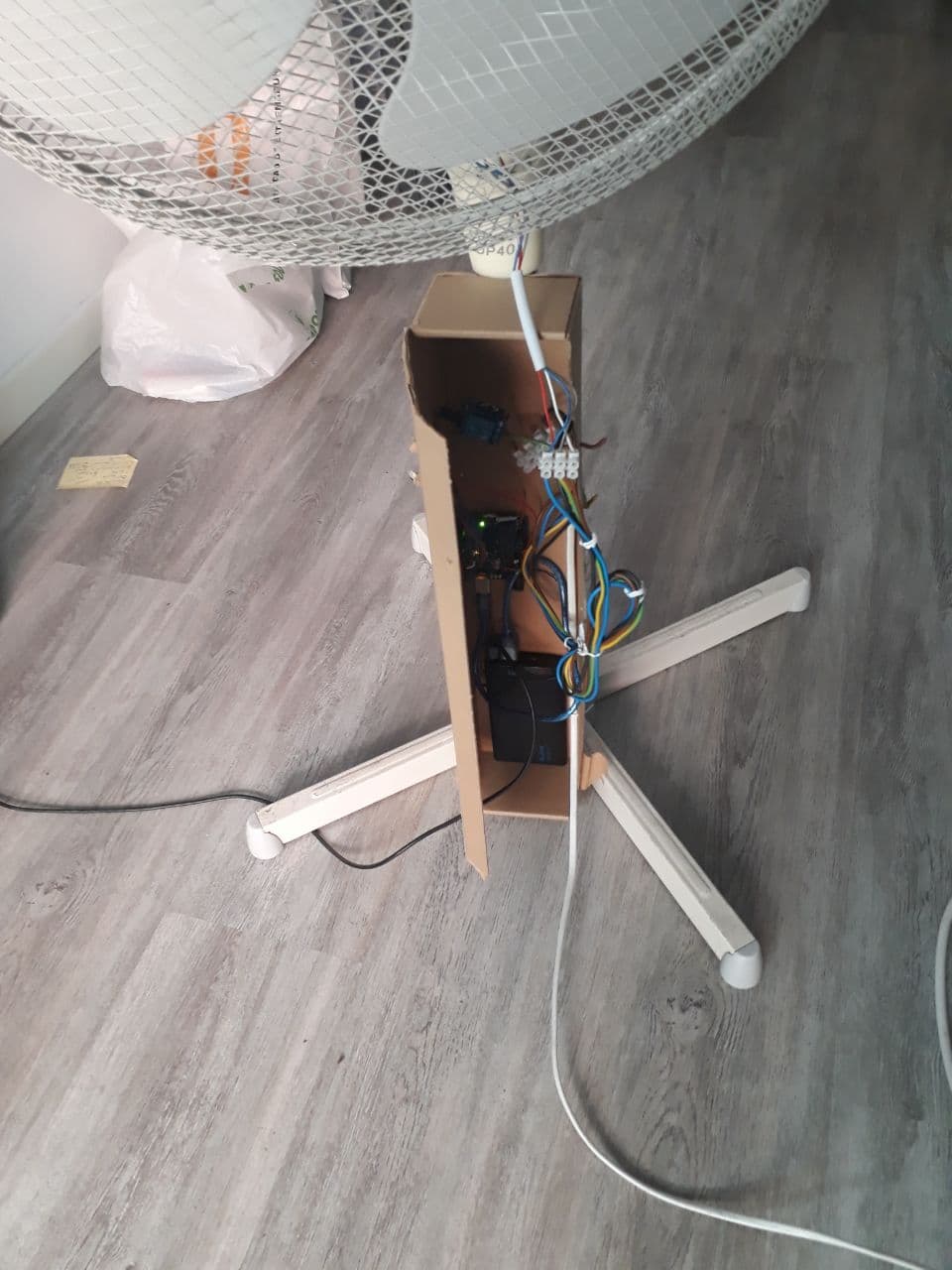 This is the final result, I have put the Infrared receiver behind the fan then when you are looking at the front of it you don't see the sensor. I have attached the enclosure with adhesive because it is not to be the final enclosure for the next summer then I just add adhesive.